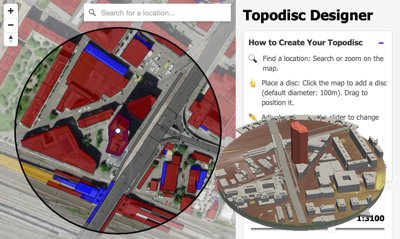 Use our Topodisc Designer to create your own Topodisc: find a location, place a disc, adjust the size and let our servers create the model for you.